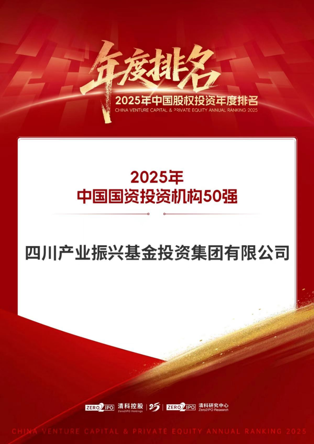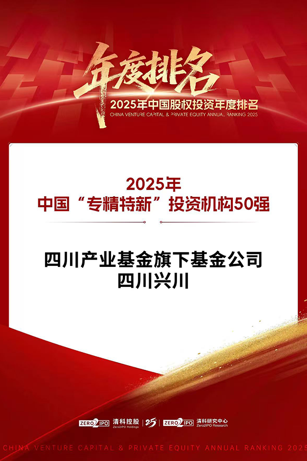 热烈祝贺四川产业基金获评清科研究中心“VC/PE综合排名奖项中国国资投资机构50强”,并在行业细分奖项中获评“中国新能源领域投资机构20强”;四川产业基金旗下基金公司四川兴川获评“中国‘专精特新’投资机构50强”。